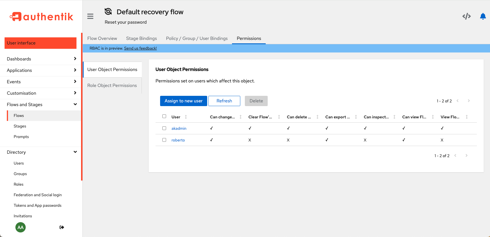 Global permissions define who can do what on a global level across the entire system. Some examples in authentik are the ability to add new flows or to create a URL for users to recover their login credentials.